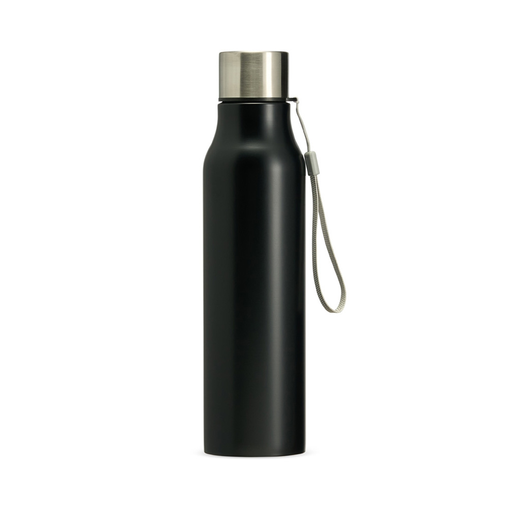 Garrafa de 750ml em inox com tampa plástica com alça. Medidas: ø75x240 mm.