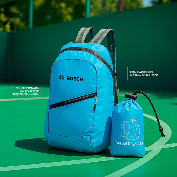 Mochila dobrável de 16 litros em tecido oxford compacta em formato de estojo. Com dois bolsos laterais em tela para garrafas, detalhe refletivo e bolso frontal com zíper. Medidas: 250x385x170 mm.