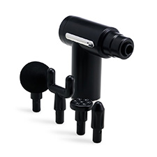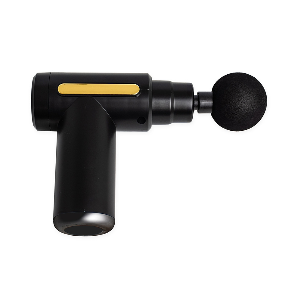 Massageador de plástico portátil com 6 níveis de velocidade e 4 cabeças diferentes para massagear. Recarregável via USB e acompanha cabo tipo-C.