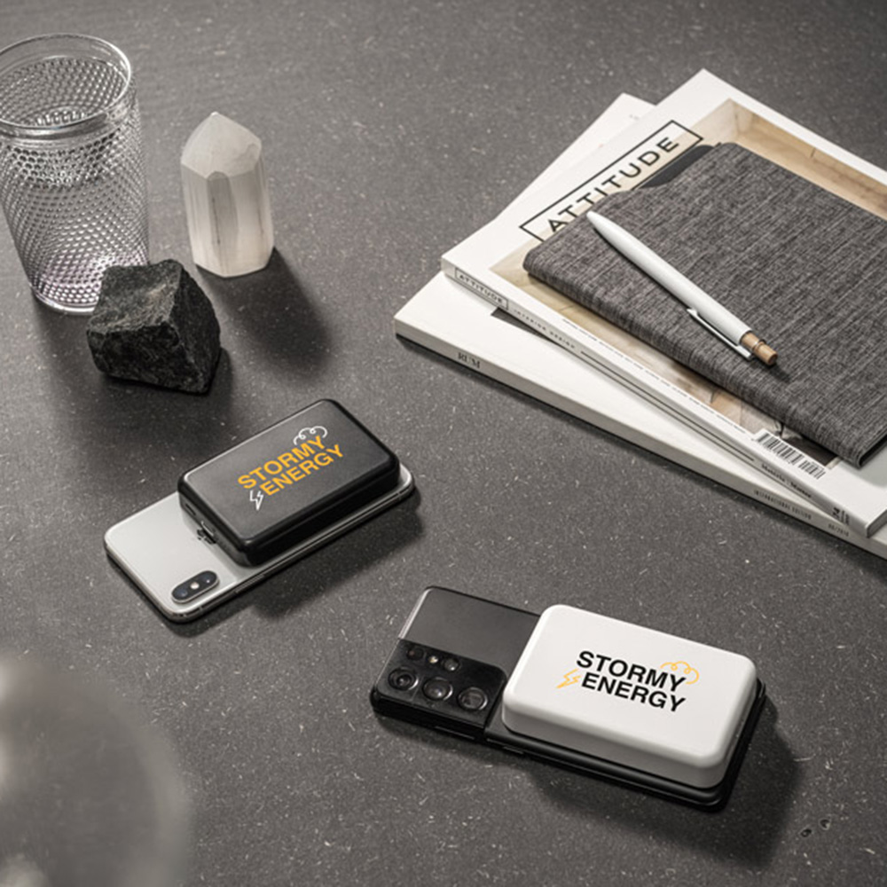 Bateria portátil em ABS 100% reciclado. Tem capacidade de 10.000 mAh e tempo de vida ≥ 300 ciclos. Possui entrada/saída USB-C e potência máxima de 15W para carregamento rápido sem fios. Medidas: 100x64x18 mm.