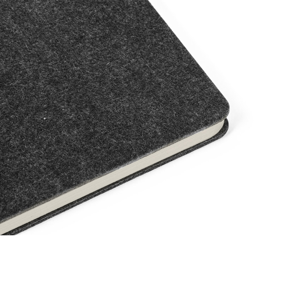 Caderno A5 de capa semi-rígida em feltro 100% reciclado, com argolas. Contém 160 páginas pautadas (70 g/m²) em papel cor de marfim 100% reciclado. Medidas: 155x219 mm.