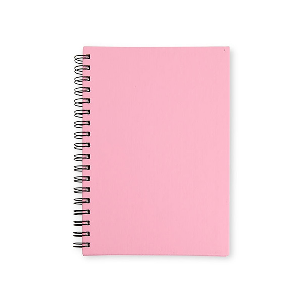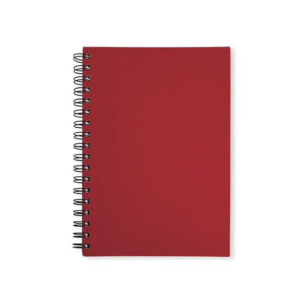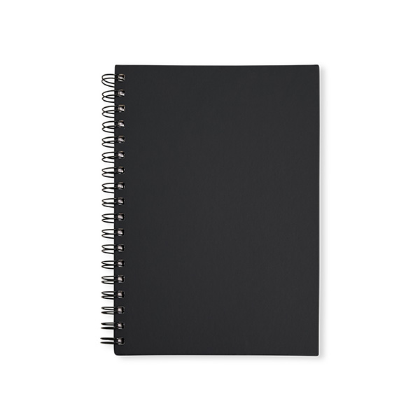 Caderno A5 plástico com wire-o metálico. Capa em PP, contém aproximadamente 80 folhas brancas com pauta. Medidas: 150x212x15 mm.