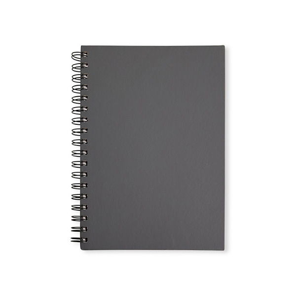 Caderno ecológico de capa dura médio e papel reciclado medindo 18x25cm.