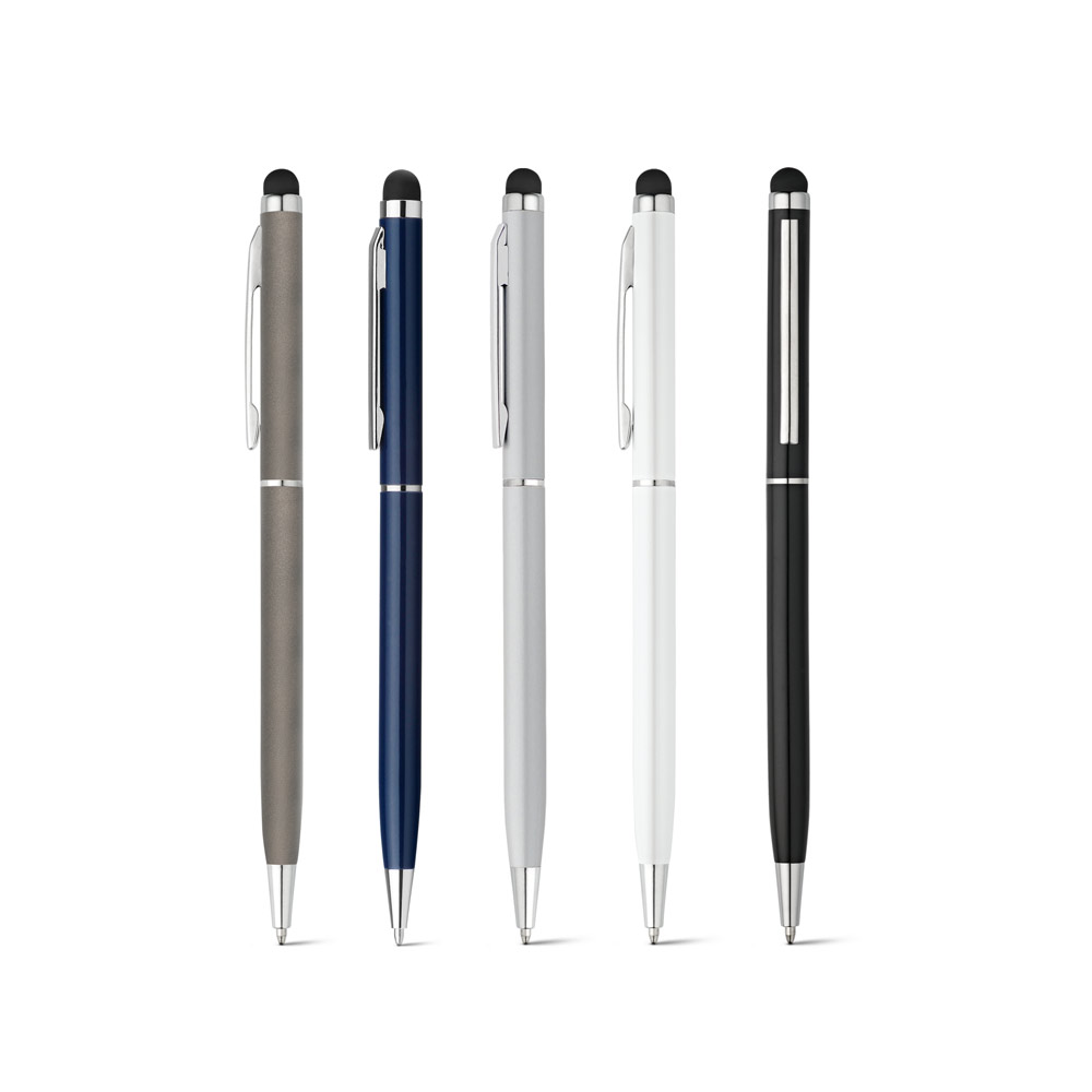 Esferográfica em alumínio com mecanismo twist. Ponteira touch em silicone. Corpo laqueado com revestimento matt. Recarga em metal tipo-Cross.