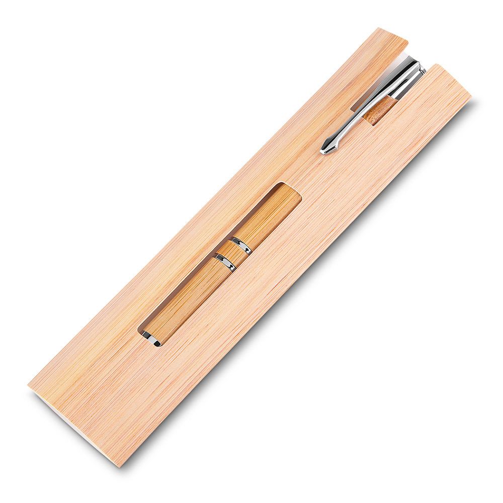 Conjunto de caneta e lapiseira ecológica em bambu com ponteira e clip prateado.