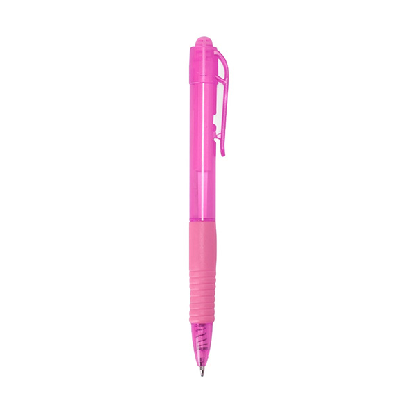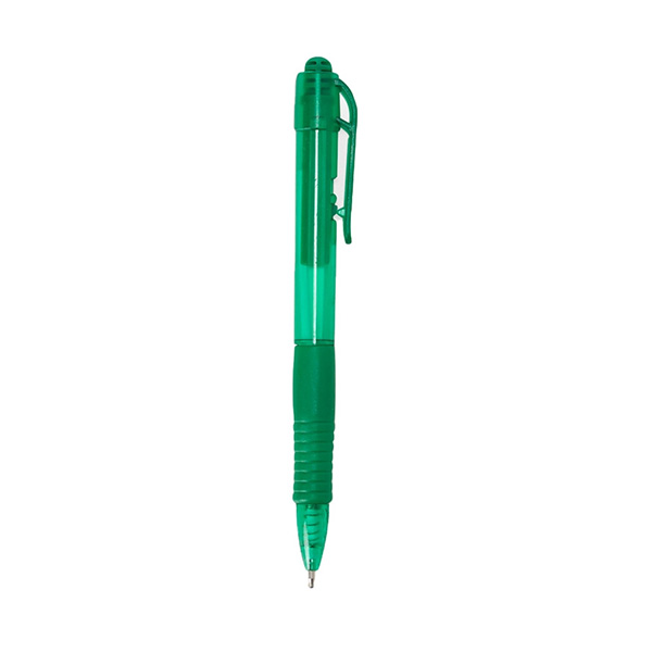 Caneta plástica translúcida colorida com base emborrachada e acionamento por clique.
