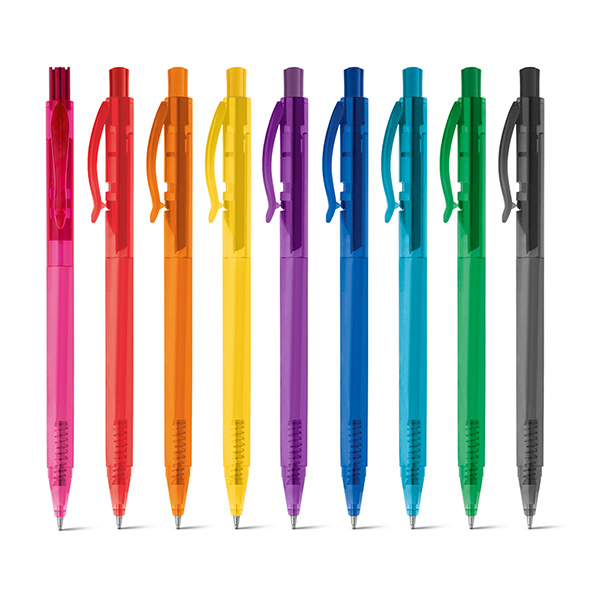 Caneta plástica translúcida inteira colorida. Clip plástico com detalhe vazado nas laterais, acionador e parte inferior preta com oito anéis em relevo. Aciona por clique. Medidas: ø13x141 mm.
