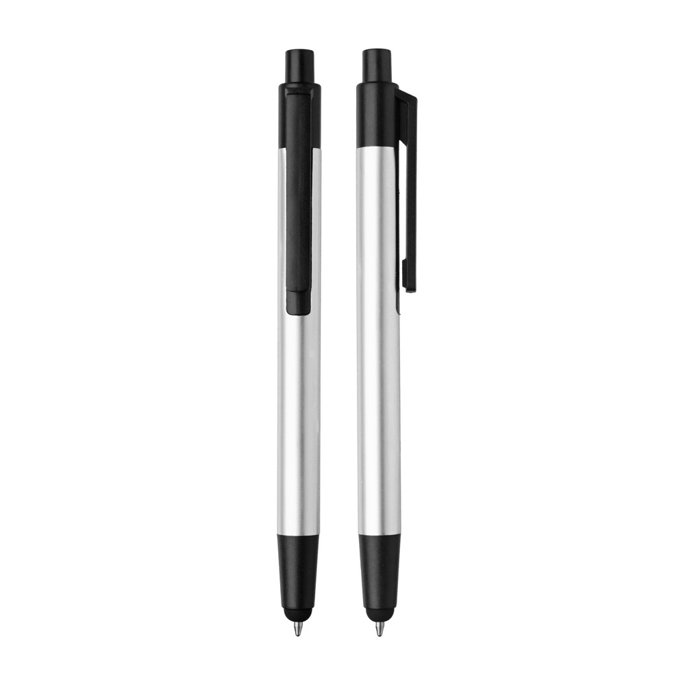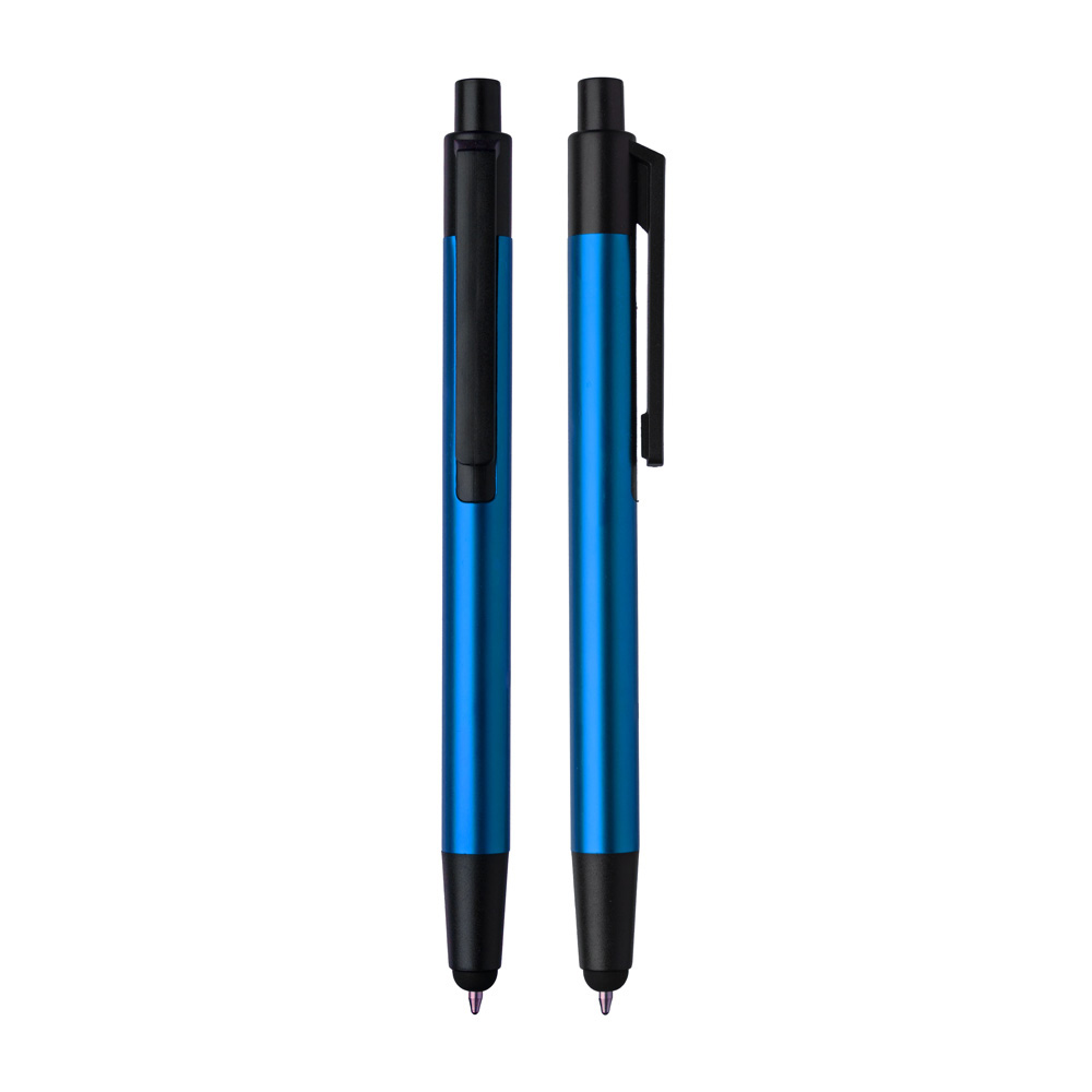 Caneta metálica com touch screen, carga esferográfica azul e acionamento por rotação.