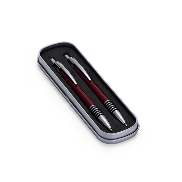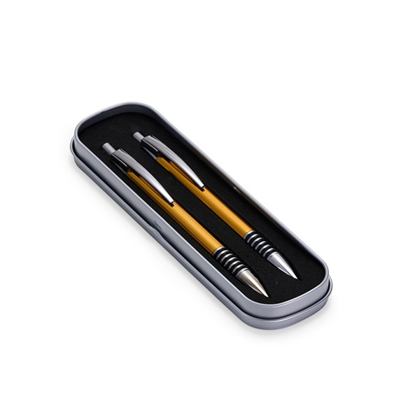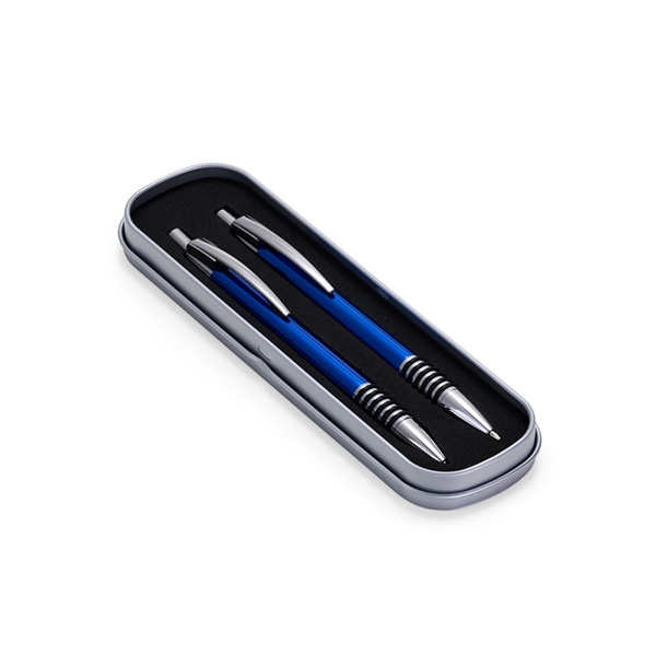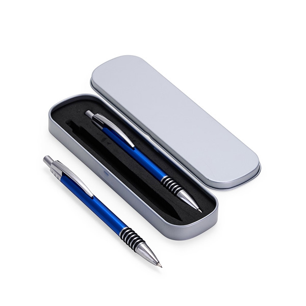 Conjunto caneta e lapiseiral metal. O estojo em metal que as acomoda, possui revestimento em espuma para evitar riscos. A caneta possui carga esferográfica azul de 1.0mm, com acionamento por clique, já a lapiseira possui grafite 0.7mm.