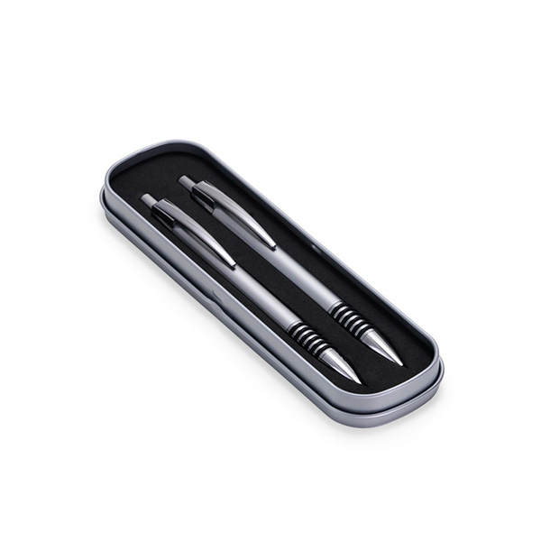 Conjunto de caneta e lapiseira metálicas em estojo de metal. Caneta e lapiseira possuem acabamento fosco, detalhe emborrachado na parte inferior, carga esferográfica azul de 1.0mm e acionamento por clique. Estojo revestido em espuma.