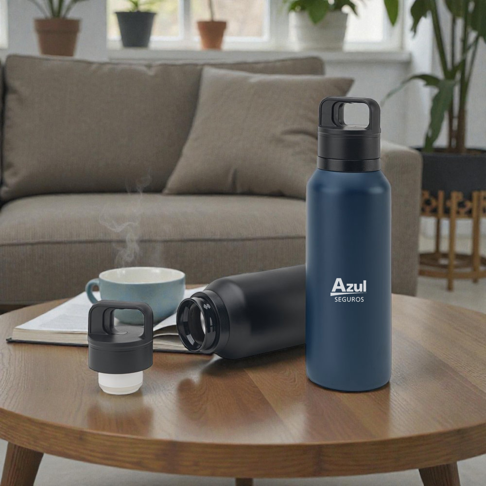 Garrafa térmica em aço inox com parede dupla com capacidade de até 650ml, parede externa com pintura a pó. Tampa rosqueável com anel de silicone para vedação. Alça de transporte em plástico. Permite-se hidratar por canudo ou bico.