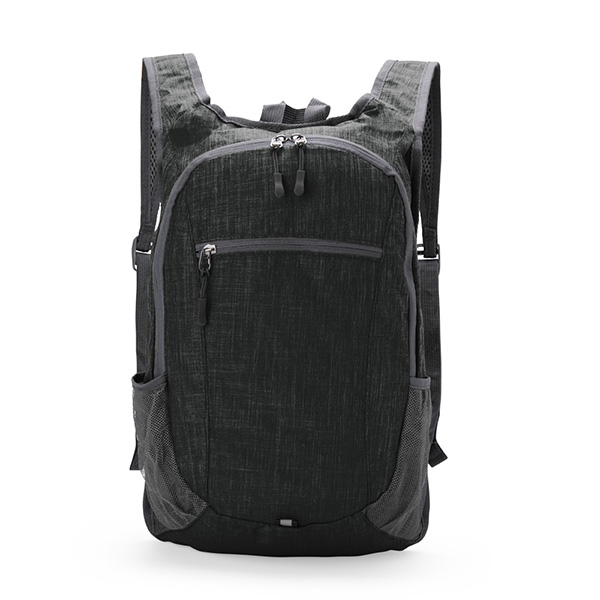 Mochila dobrável de 16 litros em tecido oxford compacta em formato de estojo. Com dois bolsos laterais em tela para garrafas, detalhe refletivo e bolso frontal com zíper. Medidas: 250x385x170 mm.