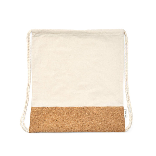 Mochila sacola em 70% algodão reciclado e 30% poliéster reciclado 180 g/m² com base em cortiça. Alças em algodão. Medidas: 370x410 mm.