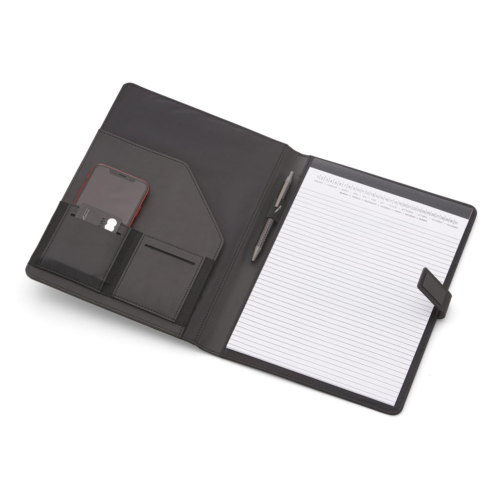 Pasta executiva almofadada com bloco de notas de 20 folhas A4. Bolso na capa 8x12cm, bolso interno para cartões, porta telefone e documentos e fechadura magnética.