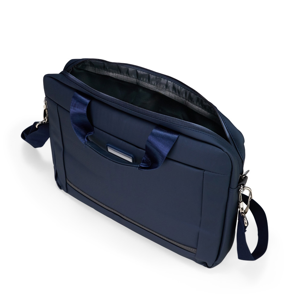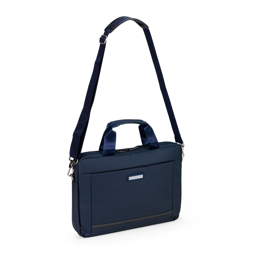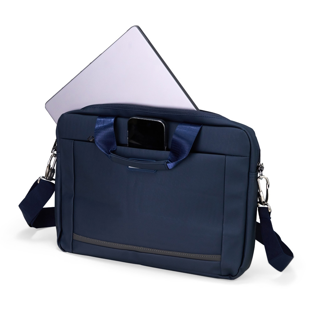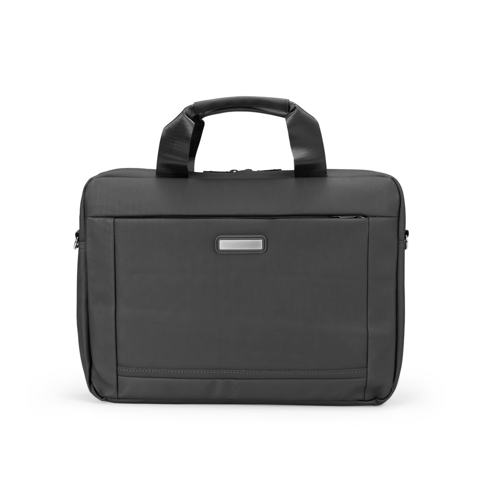 Pasta para notebook em poliéster reciclado 600D de alta densidade e forro em poliéster reciclado 210D. Possui um compartimento principal para notebook até 14 polegadas e um bolso frontal para guardar pequenos objetos.