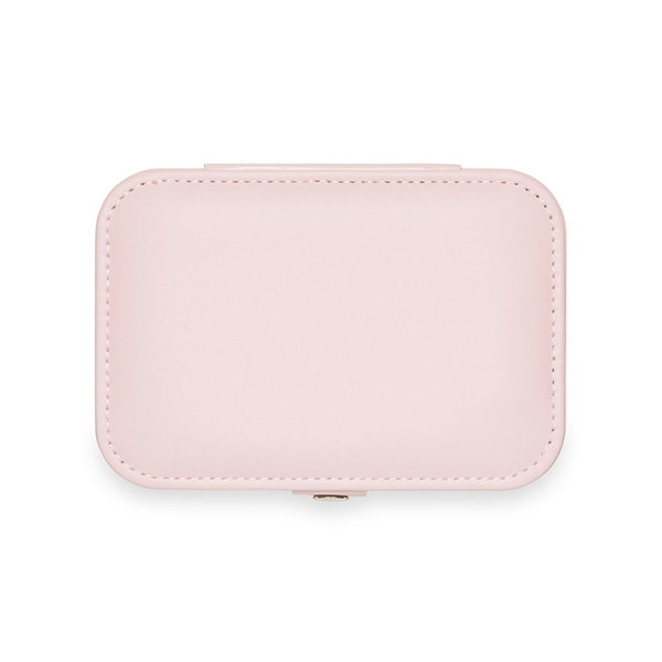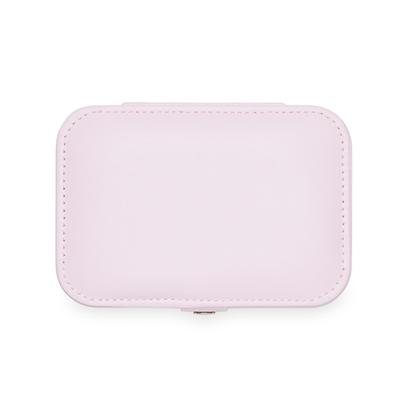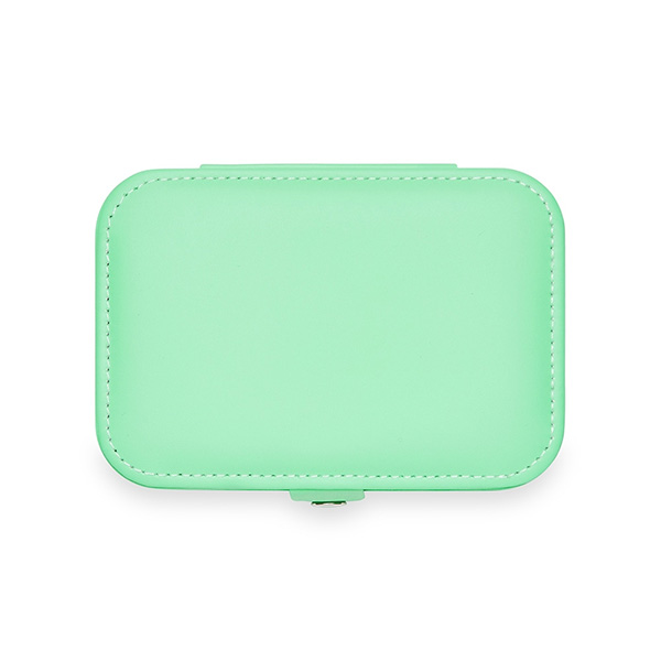 Porta-joias com espelho, produzido em plástico com alça de couro sintético e berço de silicone removível.