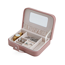 Porta-joias com espelho, produzido em plástico com alça de couro sintético e berço de silicone removível.