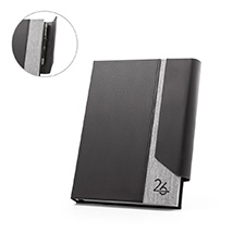 Agenda A5 em PU (58% reciclado) e PET reciclado (100% rPET) 300D com fecho magnético. Possui um suporte para esferográfica (não inclusa) e marcador em fita. Está organizada em plano diário (70 g/m²). Medidas: 148x210 mm.
