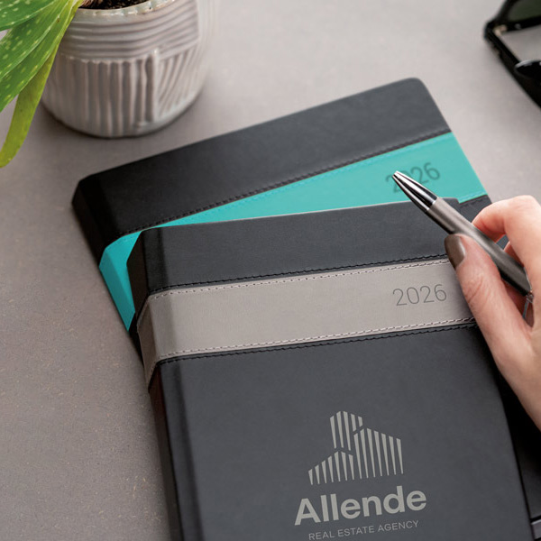 Agenda B5 em PU com marcador em fita. Está organizada num plano semanal (70 g/m²). Medidas: 175x245 mm.