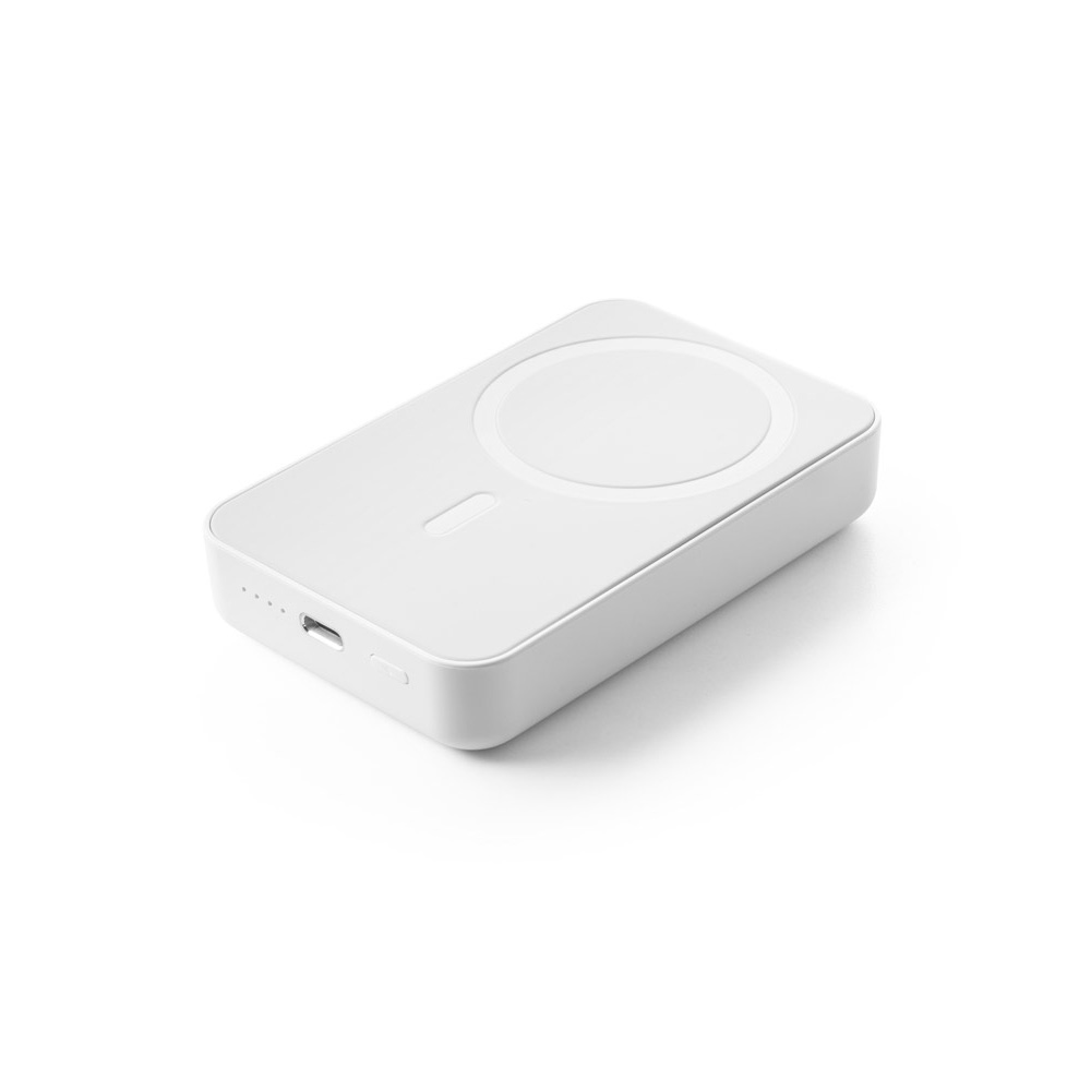 Bateria portátil em ABS 100% reciclado. Tem capacidade de 10.000 mAh e tempo de vida ≥ 300 ciclos. Possui entrada/saída USB-C e potência máxima de 15W para carregamento rápido sem fios. Medidas: 100x64x18 mm.