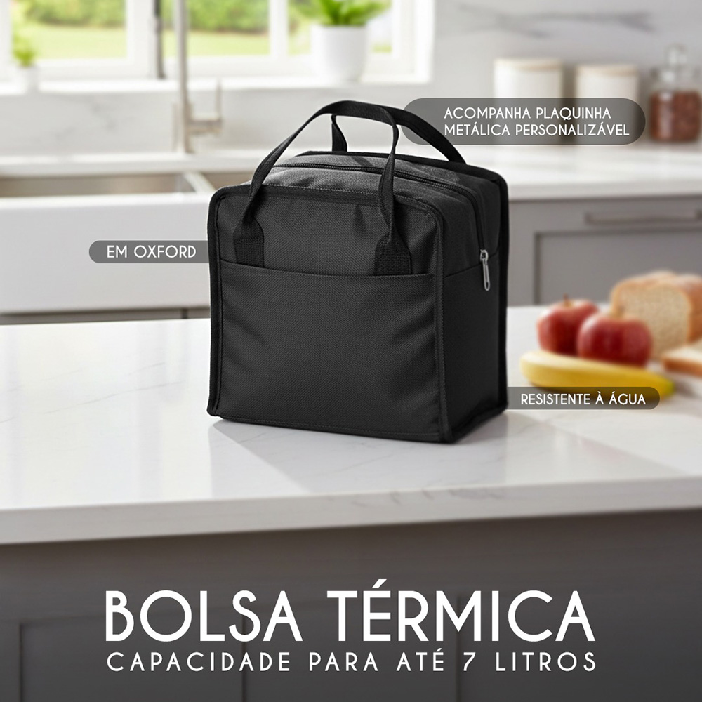 Bolsa térmica de nylon 7 litros com bolso frontal. Acompanha plaquinha metálica.