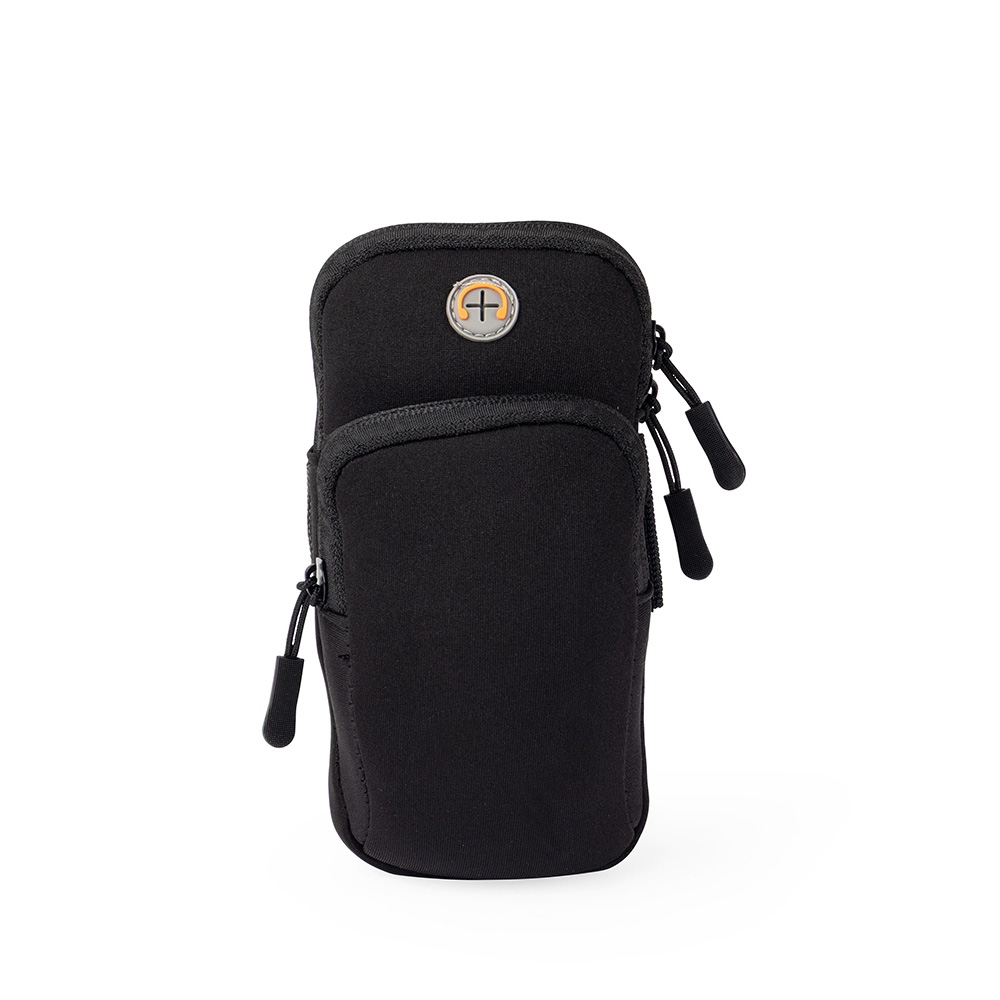 Braçadeira esportiva em neoprene impermeável. Possui dois compartimentos com fechamento em zíper: um principal, com saída para fones de ouvido, e outro na parte frontal, além de alça elástica com velcro para ajuste no braço.