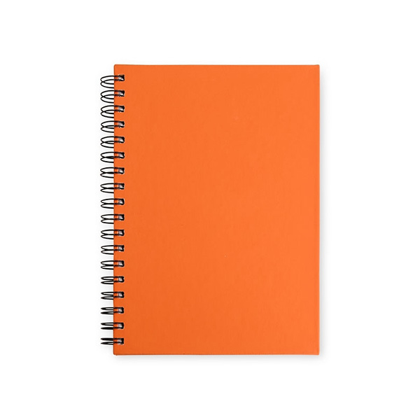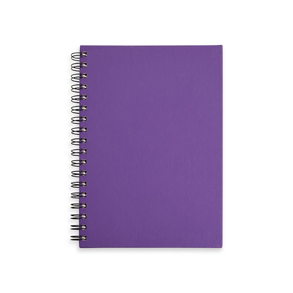 Caderno de capa dura de papel couché 150 gramas impresso em 4 cores medindo 21x28 cm. Miolo com 96 folhas 70 gramas impressas em 1 cor em offset. Acabamento em wire-o.