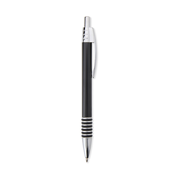 Caneta de metal com com ponteira e acionador cromado, base com anéis emborrachados e escrita azul de 1.00 mm. Medidas: ø15x143 mm.
