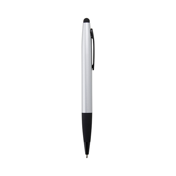 Caneta metálica com touch screen, carga esferográfica azul e acionamento por rotação.