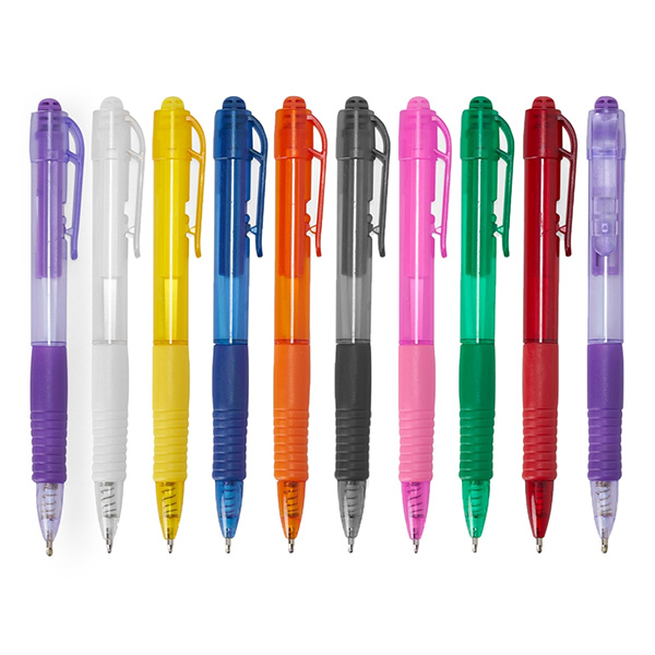 Caneta plástica translúcida colorida com base emborrachada e acionamento por clique.