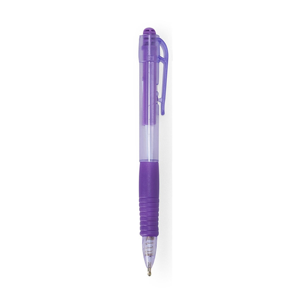 Caneta plástica translúcida com anel prata e base emborrachada. Medidas: ø16x137 mm.
