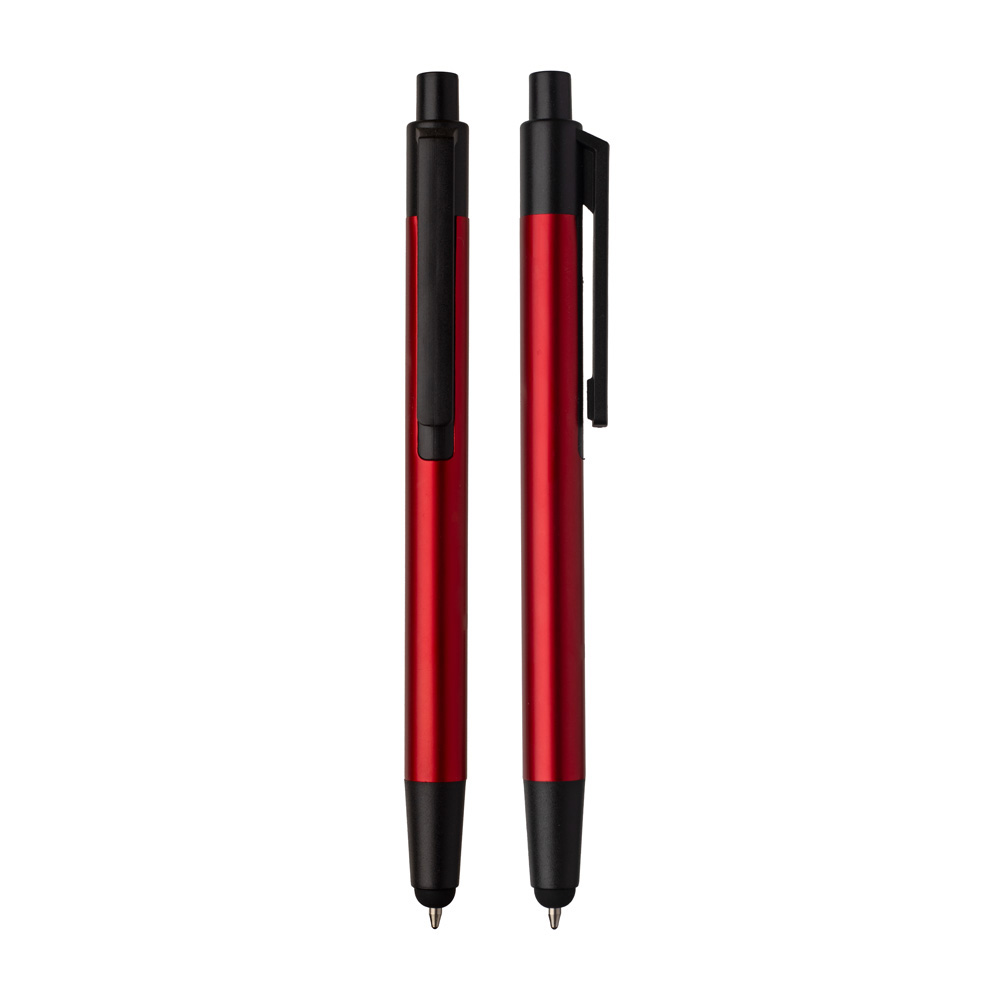 Caneta touch metal inteira colorida com detalhes preto. Clip plástico, possui touch e caneta esferográfica. Aciona por clique, esferográfica sai por dentro do touch.
