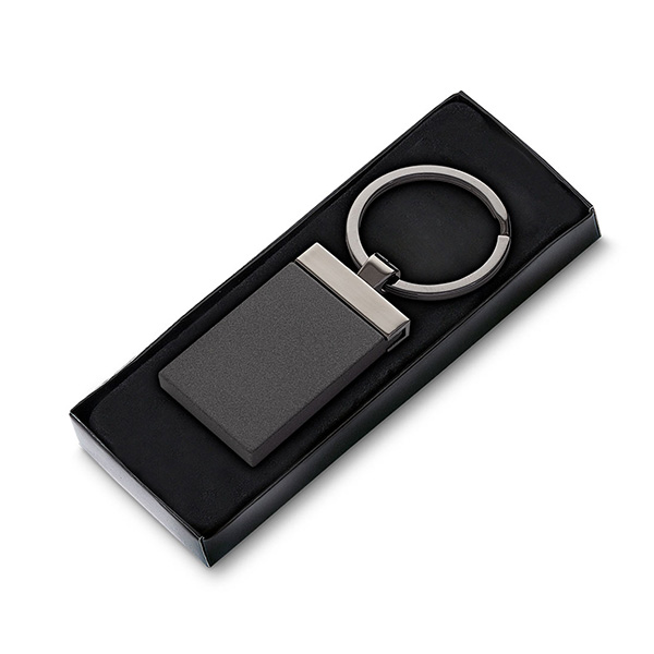 Chaveiro de metal produzido em liga de zinco, ferro e alumínio em formato retangular com argola. Acompanha caixinha de papel preta brilhante. Medidas: 85x35 mm.