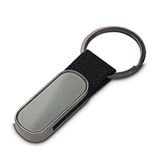 Chaveiro de metal com argola e couro sintético preto. Acompanha caixinha preta. Medidas: 32x105 mm.