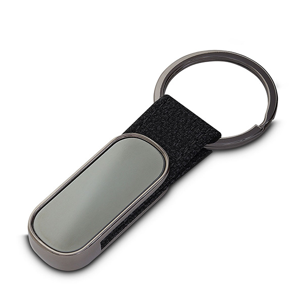 Chaveiro produzido em liga de zinco, ferro e PU. Medidas: 85x35 mm.