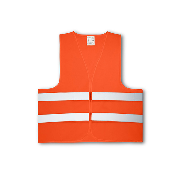 Colete de alta visibilidade em poliéster com certificado pela norma EN 17353. Colete refletivo com 2 bandas refletoras horizontais e elásticos laterais. Medidas: 540x620 mm.