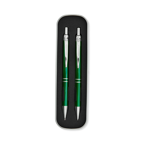 Conjunto de caneta e lapiseira metálicas em estojo metal. Caneta e lapiseira possuem acabamento brilhante, carga esferográfica azul de 1.0mm e acionamento por rotação.
