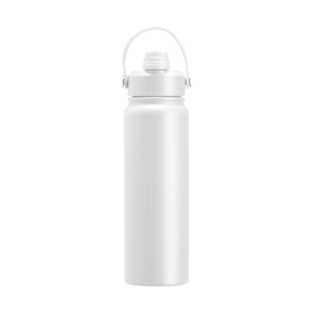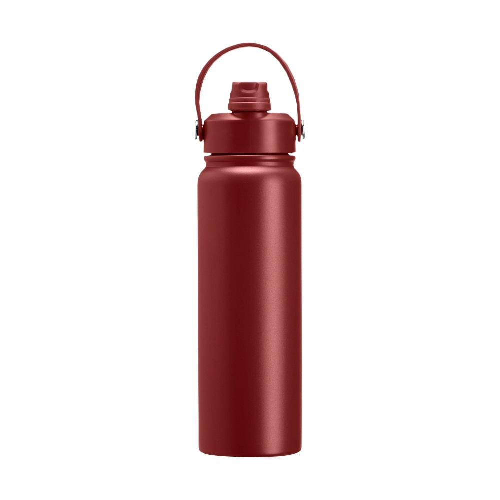 Garrafa térmica em aço inox com parede dupla com capacidade de até 650ml, parede externa com pintura a pó. Tampa rosqueável com anel de silicone para vedação. Alça de transporte em plástico. Permite-se hidratar por canudo ou bico.