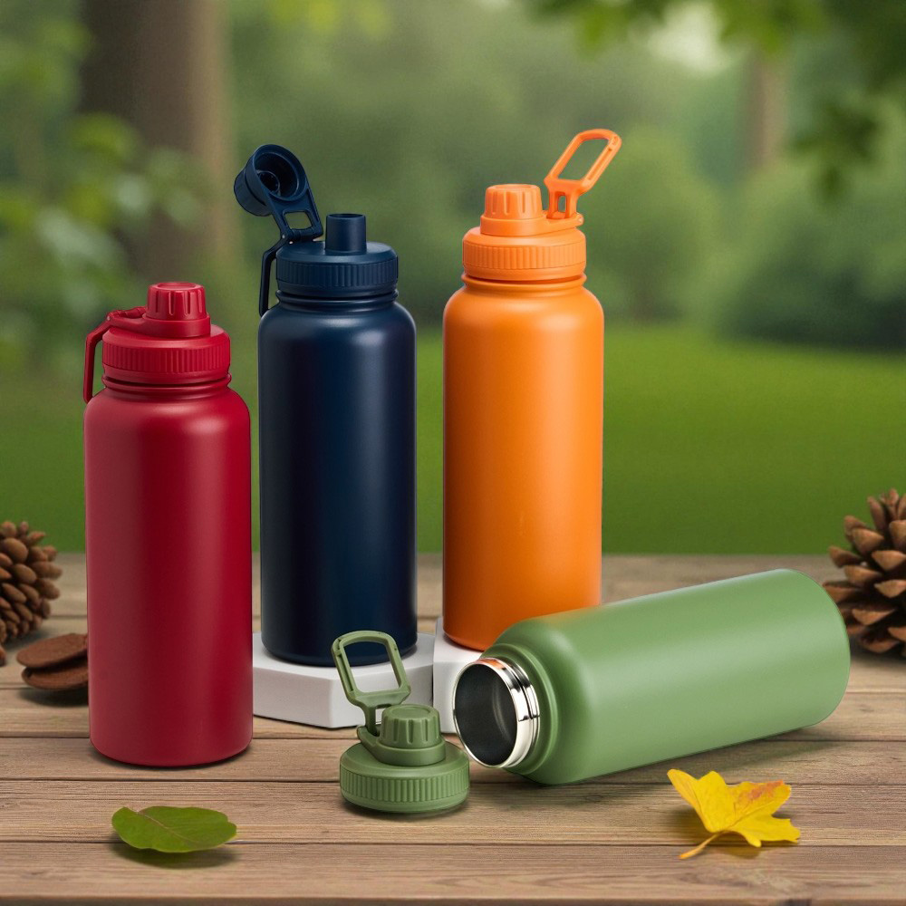 Garrafa térmica inox de parede dupla de 1 litro com uma tampa rosqueável e uma alça retangular. Medidas: ø90x255 mm.