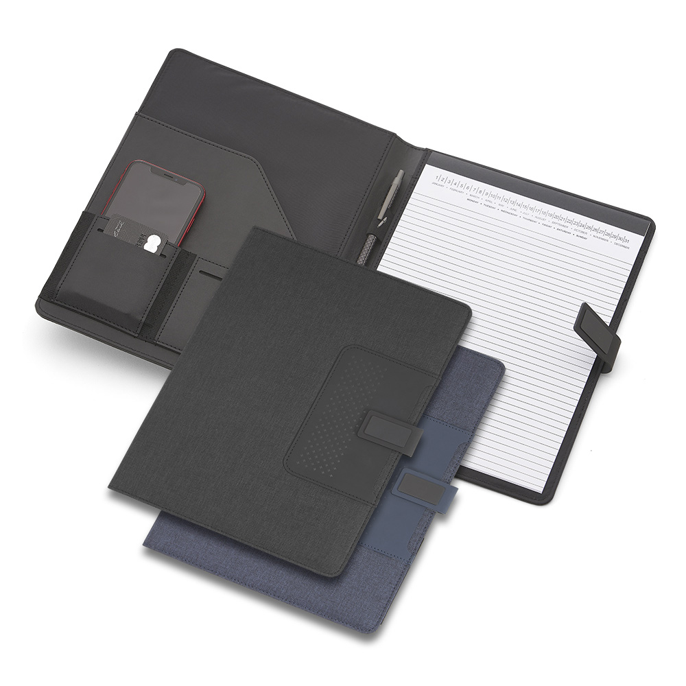 Pasta executiva almofadada com bloco de notas de 20 folhas A4. Bolso na capa 8x12cm, bolso interno para cartões, porta telefone e documentos e fechadura magnética.