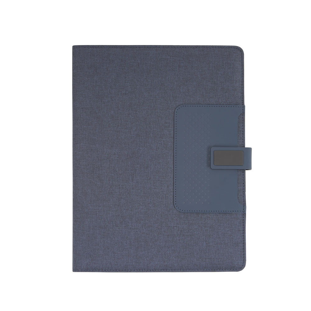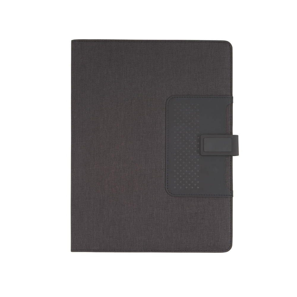 Pasta de convenção A4 de couro sintético e 1680D. Fecho magnético. Bloco: 20 folhas pautadas. Esferográfica não inclusa.