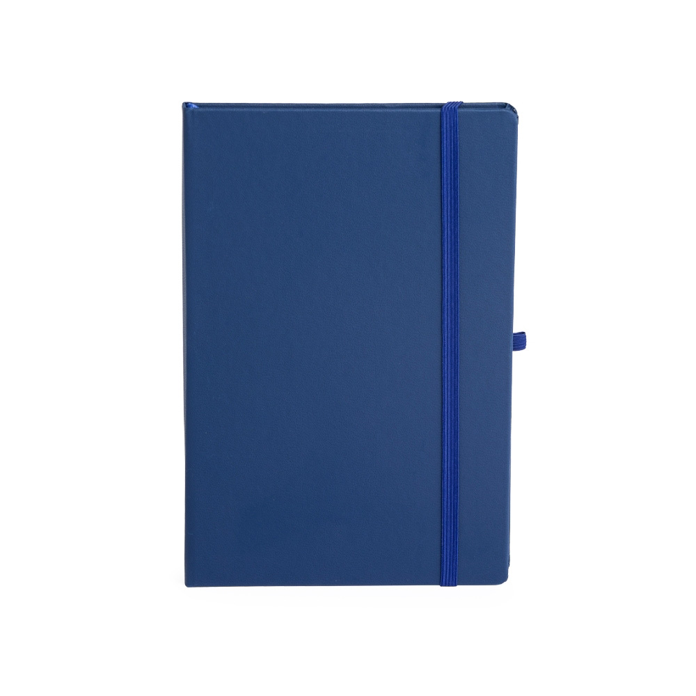 Caderno de anotações com elástico, capa dura em tecido poliéster, miolo 80 folhas pautadas na cor bege. Medidas: 145x214x15 mm.