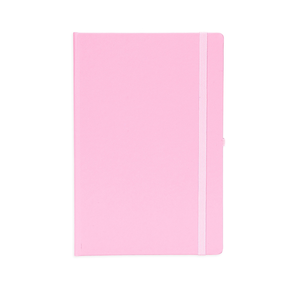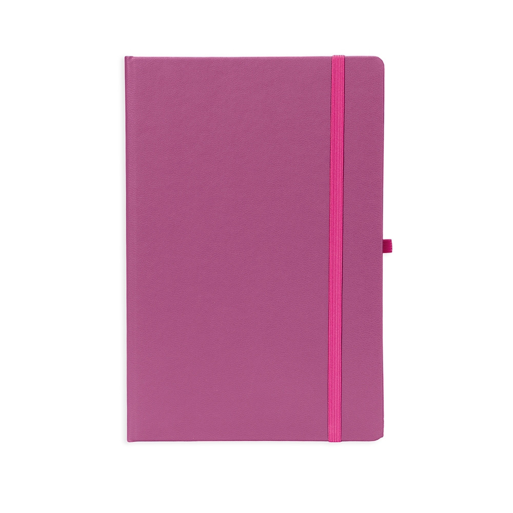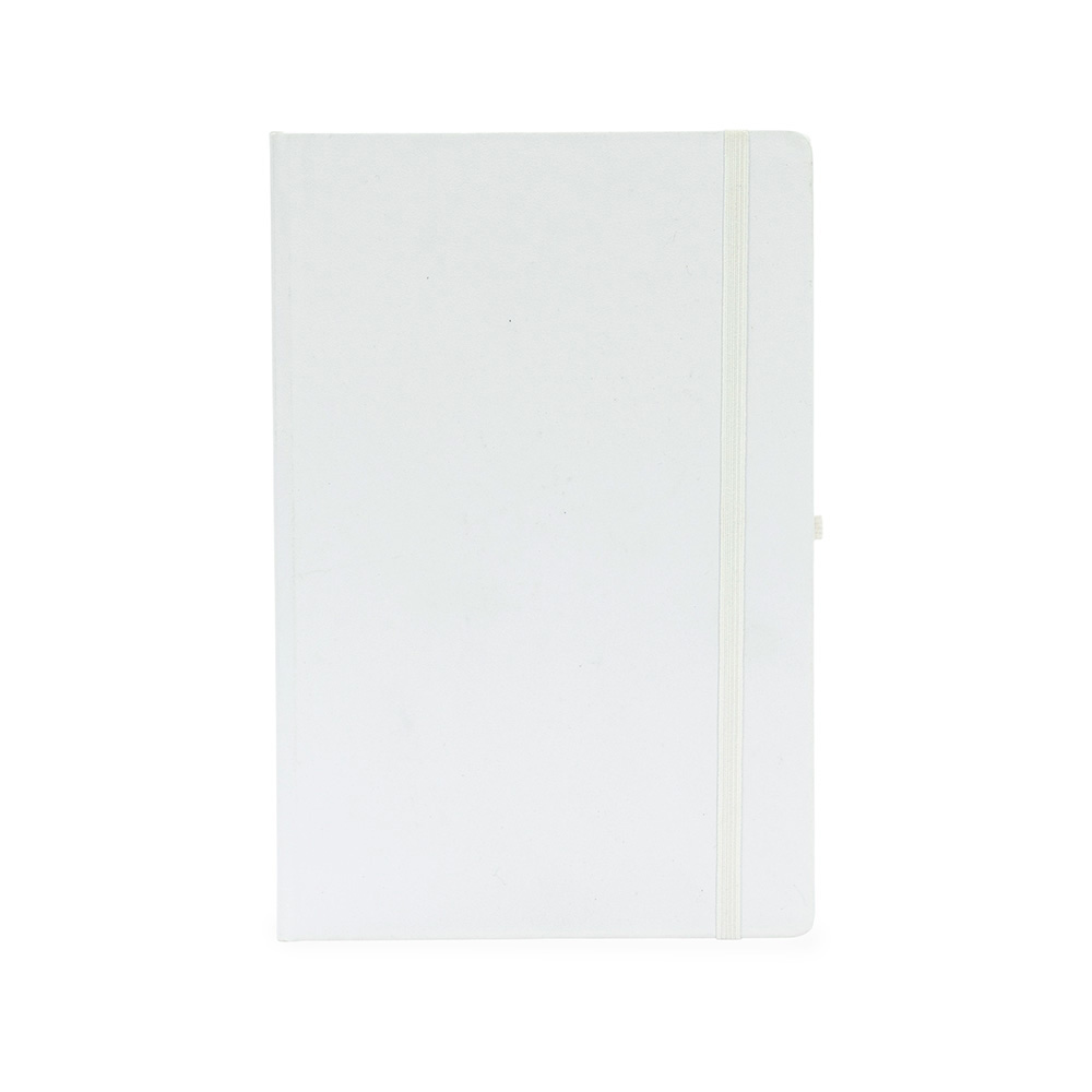 Caderno de capa de poliéster e rPET com 96 folhas brancas pautadas. Marcador de página em cetim e elástico para fechamento com suporte para caneta. Medidas: 142x210x15 mm.