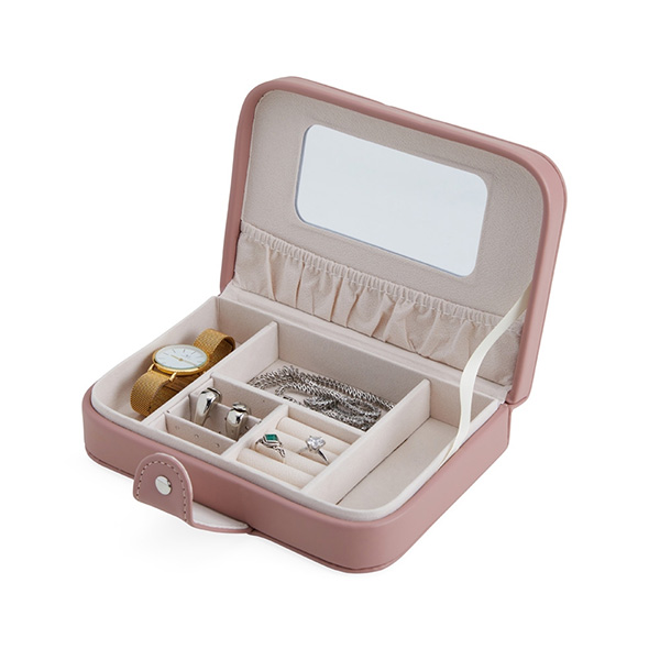 Porta-joias de couro sintético com revestimento aveludado. Possui compartimentos internos para anéis, brincos, pulseiras e colares.
